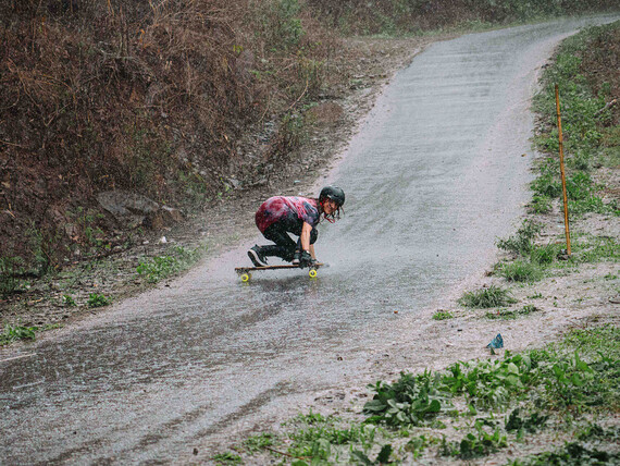 Ich glaube, beim Downhill-Longboarden ist es besser, dass man sich langsam steigert und nicht gleich schon am Anfang zu viel Selbstsicherheit aufbaut. Denn wenn man erstmal gelernt hat, wie man slidet und wie man bremst, dann fühlt sich das ja sehr kontrolliert an – vielleicht wie auf einem Fahrrad, das ja auch Bremsen hat - und man denkt: Okay, ich kann schnell fahren!